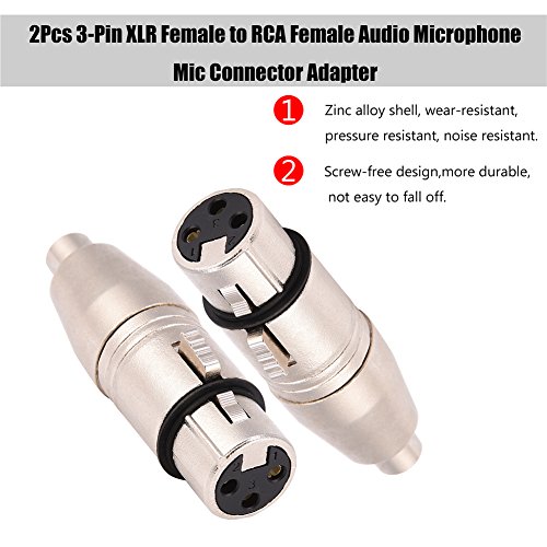 XLR 3-pins vrouwelijk naar (compatibel met) RCA vrouwelijke connector met hoge geleidbaarheid en superbestendigheid. Met de behuizing van zinklegering is de connector slijtvast, drukbestendig, geluidbestendig en brengt u geen geluidsoverlast. Ideaal voor XLR-audiokabelverbinding van spelers, microfoons, gitaren, podiumlampen, mengpanelen, enz. De verbindingskwaliteit is goed.